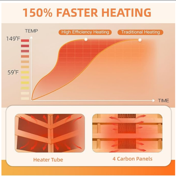 【Hatékony fűtési technológia】 4 szénpanelrel és 1 széncsővel felszerelt 1 fős infravörös szauna 360 fokos surround fűtést biztosít, biztosítva az egyenletes hőelosztást. Általában mindössze 10-15 perc alatt felmelegszik, lehetővé téve, hogy késés nélkül élvezze a szauna élményét.