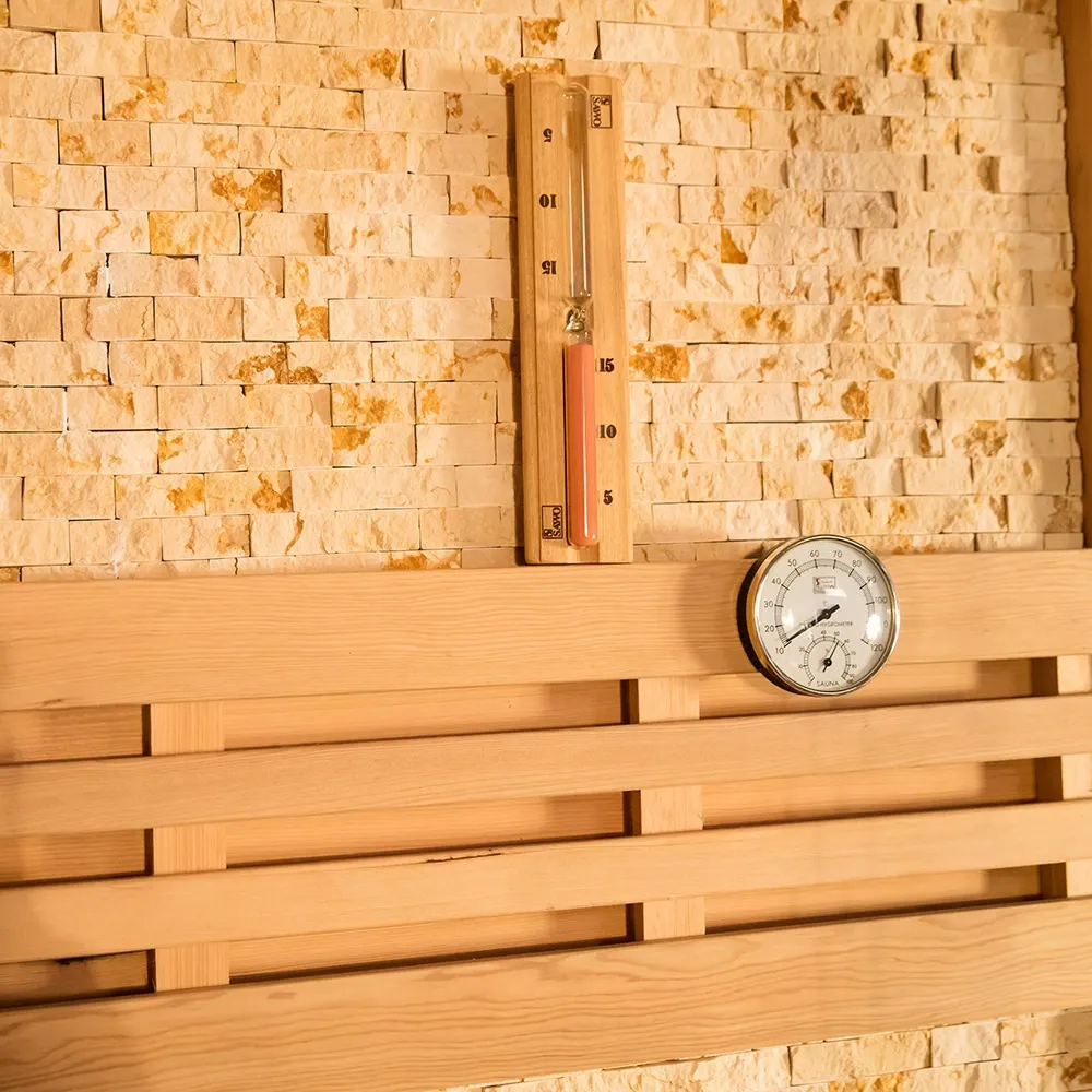 - Hőmérséklet-érzékelő: A szauna oldalfalába építve pontosan rögzíti a hőmérséklet-változásokat a különböző területeken, egyenletes felmelegedést biztosítva.