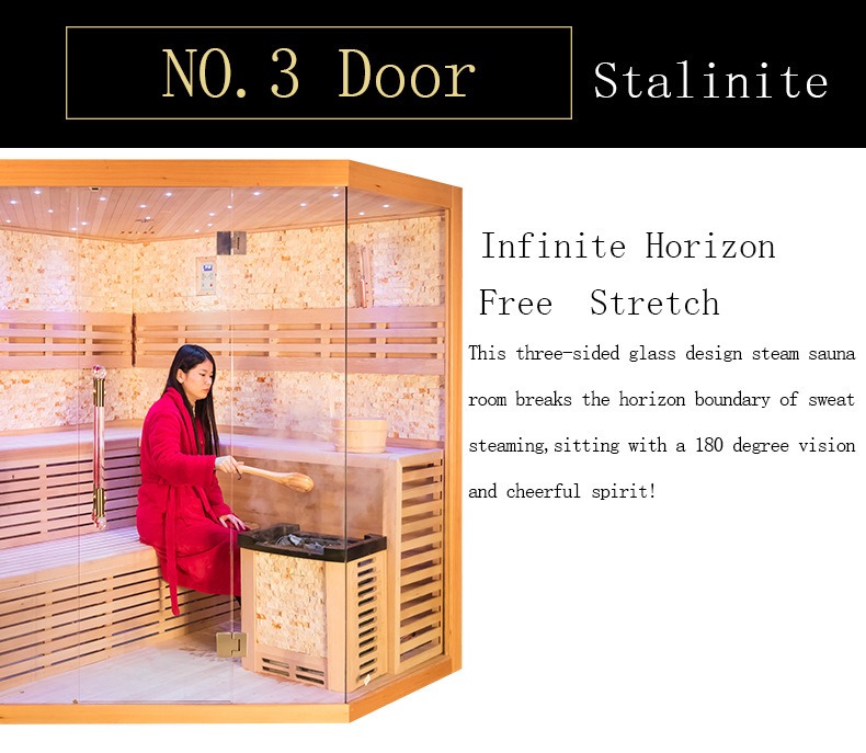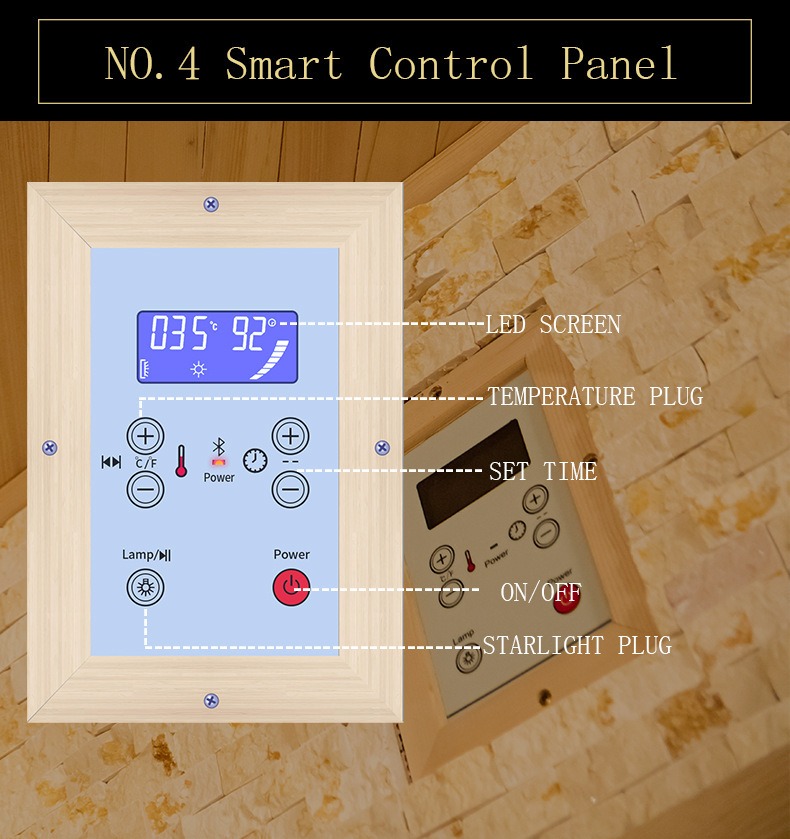 Az innovatívan háromoldalas Sztálinit speciális üvegajtószerkezettel rendelkező üveg speciális, magas hőmérsékletű temperáláson esik át, így kiemelkedő hőállóságot és ütésállóságot biztosít. Még 70 ℃ feletti hőmérsékleten is megőrzi stabilitását a szaunában, rendkívül nagy átlátszósággal és optikai torzítás nélkül. A háromoldalas üvegkialakítás 180 fokos akadálytalan, széles kilátást biztosít, teljesen megtörve a hagyományos szaunák szűk és zárt érzését. A felhasználók vizuális kapcsolatot tarthatnak fenn a külső környezettel, miközben élvezik a szaunát, így ideális otthoni erkélyekre, udvarokra és más forgatókönyvekre – lehetővé téve, hogy a kültéri tájat értékelje, miközben hőterápiát tapasztal a pihentebb és kényelmesebb lélek és test érdekében. Ezen túlmenően a belsőleg integrált starlight ambiance rendszer csillogó csillaghatást hoz létre a felső és oldalfalakon található rejtett LED-es fénycsíkokon keresztül. A lágy fény kiegészíti a meleg gőzt, hatékonyan enyhíti a szem fáradtságát és elősegíti a magával ragadó és kellemes szauna hangulatot.