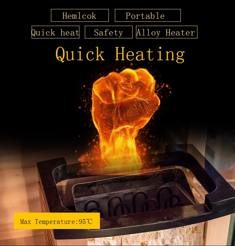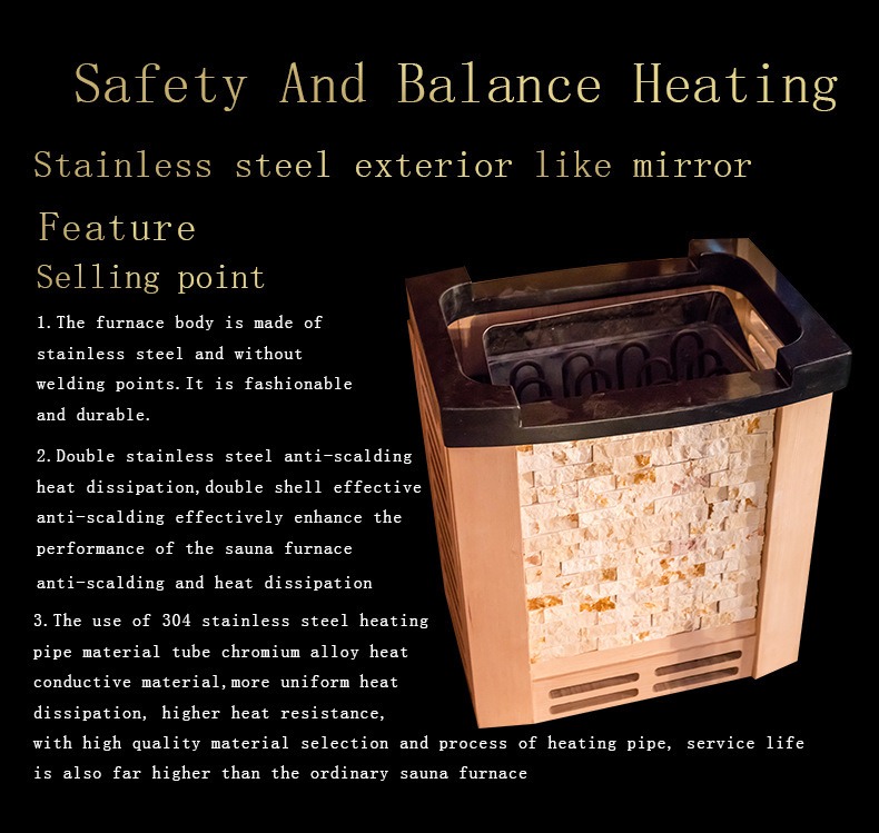 A magfűtőelem biztonságos és tartós, kiváló minőségű szauna kályhát alkalmaz, szigorú megfontolások mellett az anyagtól a szerkezetig: