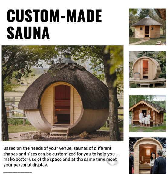 Felügyeleti és tapasztalati kiegészítők: Érzékeny hőmérséklet- és páratartalom mérő, fa homok időzítő (időzítés + rituális érzékelés), kézzel csiszolt fa vödör és merőkanál, amely visszaadja a hagyományos szauna rituális érzéket, miközben biztosítja a kényelmes használatotKültéri üvegajtó kültéri gőzfürdő.