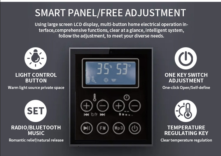 AKültéri üvegajtó kültéri gőzfürdőkültéri specifikus, nagyméretű LCD intelligens vezérlőpanellel van felszerelve (víz- és porálló kivitel), amely lehetővé teszi az "egygombos vezérlés" kényelmes kezelését: