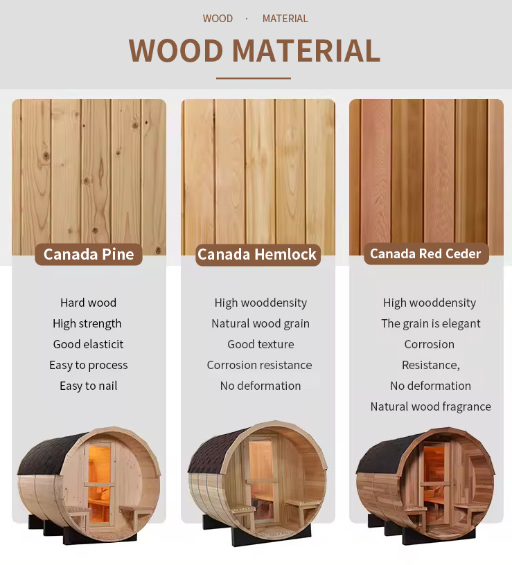 Biztonsági védelmi tartozékok: Kültéri robbanásbiztos lámpák (magas hőmérsékletnek ellenálló robbanásbiztos üveg + vízálló héj), korróziógátló fa lámpabúrák (kézzel polírozva), egyensúlyba hozza a kültéri biztonságot és a természetes textúrátKültéri üvegajtó kültéri gőzfürdő.