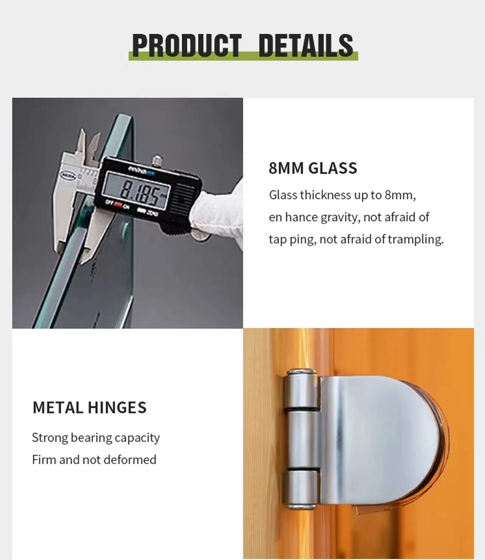 - Nagy teherbírású fém zsanérok – Rozsdamentes acél zsanérok 100 kg teherbírással, biztosítva, hogy az ajtó éveken át egyenesen maradjon.